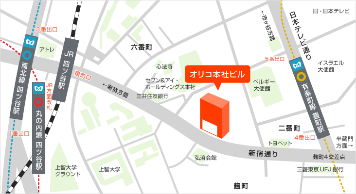交通・アクセス 「麹町駅」4番出口より徒歩3分、「四ツ谷駅」麹町口より徒歩5分