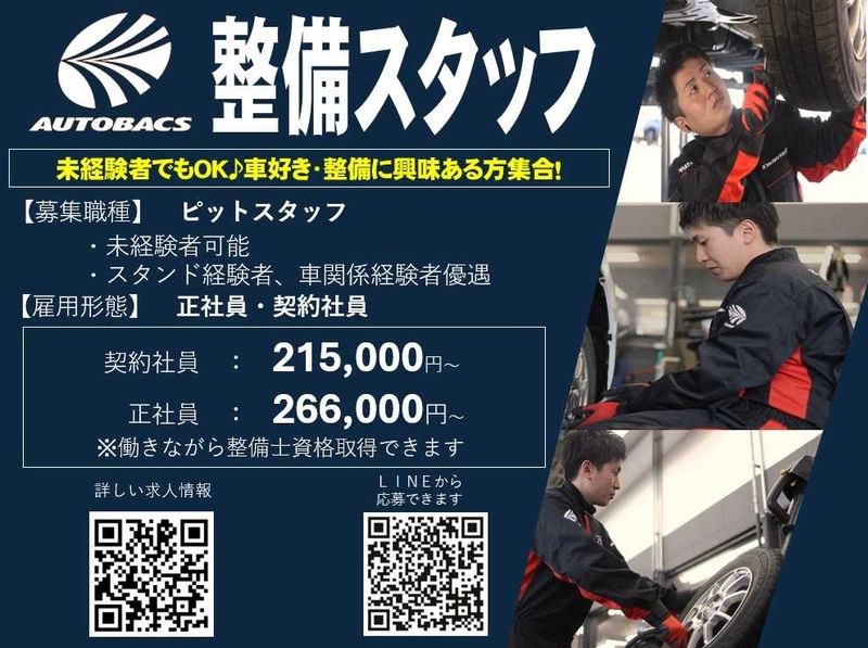 仕事内容 【スーパーオートバックスSAPPORO】業務拡大|未経験OK・学歴不問|自動車整備サポート|契約社員(正社員可能)|充実待遇|正社員登用あり&実績多数 ●希望によって未経験でも即正社員雇用可能! ●資格取得も支援!長く安定したキャリア設計が可能! ●未経験OK!異業界&異業種からの転職も応援! ●充実の研修制度でお仕事スタートも安心! ●社員割引でカー用品もお得! カー用品専門店のピットコーナーで整備のお仕事をお任せします。 店舗一体型の整備工場でサポートスタッフとしてスタートしていただきます。 ・タイヤ、オイル、バッテリーなど消耗品パーツの交換 ・カーナビやドライブレコーダーなどカー用品の取付や交換 ・車検の受付、業務 ・カスタマイズや修理、板金塗装 ・お客様対応(故障や破損など修理箇所のヒアリング、車検や定期点検についての説明)など ●未経験・これから資格取得を目指す方 オイル・タイヤ交換、洗車など比較的にカンタンな業務からスタート! ●経験・知識・資格をお持ちの方 経験や技量レベルに応じ、車検や各種整備などの業務をお願いします! ●充実フォロー&サポート 知識や技術を考慮してお任せするため、経験に不安がある方もご安心ください。 作業の流れなどをイチからレクチャーし、お仕事スタートをサポートします! 「クルマが好き、興味がある」という方から「一流のメカニックを目指したい」という方まで、一人ひとりに寄り添った育成プログラムでお迎えします。 国内外のさまざまな車種に触れることができるため、楽しみながら成長を実感できる環境です。 アピールポイント 支援制度で資格取得者多数誕生! 自動車整備士や自動車検査員を目指す方は、働きながら資格取得が可能です。 受験費用など資格取得にかかる費用のサポートに加え、資格手当(社員登用後)の支給も! 未経験から多数のスタッフが自動車整備士の合格を実現しています! 2023年度:27名 2022年度:22名 2021年度:11名 ※ 資格取得までの流れ ・3級整備士:実務経験1件以上→整備士講習→合格 ・2級整備士:3級整備士資格→実務経験3年以上→講習→合格 給与を得ながら、入社から最短1年で国家資格の取得が可能! 国家資格保有者も多数在籍するため、豊富な知識と技術に触れながら成長できる職場です。 登用制度で約7割が正社員に! 契約社員から正社員を目指す方を応援します。 最短2ヶ月で正社員に登用された実績もあり! 実力を身につけ、長く安定した将来設計を立てることが可能です。 ※未経験でも正社員雇用が可能となります。面接時にご希望をお伝えください! 【1】 契約社員 【2】 正社員登用試験(毎年3月) 【3】 正社員登用 ※ 正社員への登用は一定期間の勤務実績と店長推薦が必要 ___________________________________ 【LINEでの応募はこちらから!】 ※ 友達追加で「応募」となります。 ※ トークルームで求人の「店舗・職種・雇用形態」情報の送信をお願いします。 ※ お問合せもLINEからご連絡をお願いします。 採用LINE IDはこちら→ @589hkwr