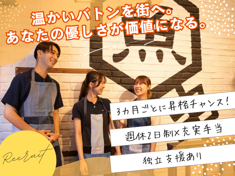 求めている人材 飲食業界での勤務経験・マネジメント経験のある方 \こんな方はなお歓迎!/ ✅相手の気持ちに寄り添える“優しい心”を持っている方 ✅小さな変化に気づけるなど、繊細な感性をお持ちの方 ✅笑顔に自信があり、周囲を明るくできる愛嬌のある方 ✅家族や仲間を大切にし、思いやりの気持ちを行動に移せる方 ✅役割を押し付けず、自然と助け合える協調性のある方 ✅チームで働くことに楽しさを感じられる方 ✅相手を喜ばせることにやりがいを感じられる方