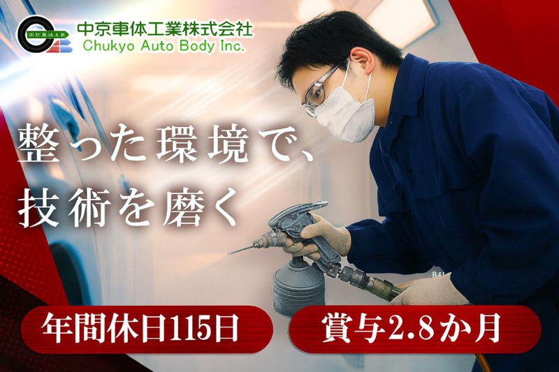 【仕事内容】 【こだわりの一台を創る。あなたの技術が輝く】 鈑金・塗装・車検・整備等を行う当社で、新たに乗用車の板金スタッフを募集します! \整ったブースで最高の一塗りを/ 当社では、しっかりとした作業ブースを完備しているため、安心して作業に集中できます。快適な作業空間で、技術を存分に発揮してください! 【具体的な仕事内容】 ・塗装 ・部品などの取り外し ・養生 ・乾燥(この間に取り外し作業など) ・養生したテープの取り外し、部品の取り付け ==================== ✅お休みも給与も諦めたくない ==================== そんなあなたの思いを応援いたします! ⭕経験・スキル次第で月給35万円も可能! ⭕年間休日115日以上 などワークライフバランスを重視した働き方を実現。 現職で給与が上がらない、残業や急な仕事が多く家族との休みが取れないなどのお悩みをお持ちの方はぜひご相談ください! ===================== ✅安定した会社で働きたい方必見! ===================== 中京車体工業株式会社は1945年に創業を開始した、歴史のある会社です。 グループ会社も複数あり様々なサービスを提供しております! 充実した福利厚生を完備しており、経験やスキルを活かすのにとっておきの会社です。 不明点などは面接時にすべてお答えいたしますので、まずはお気軽にご応募ください! 【求人ID-TSS】