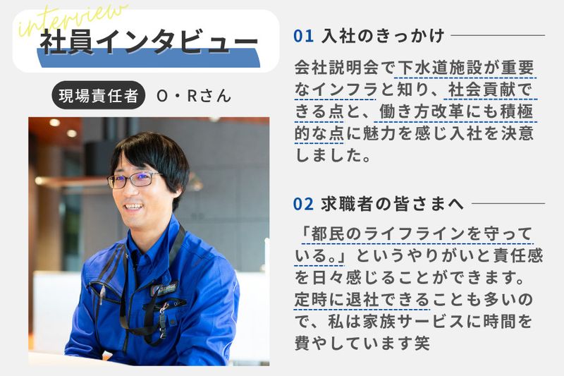 【仕事内容】 \仕事も生活も妥協したくないあなたへ!/ 公共工事の現場を支える現場事務スタッフを募集! 【仕事内容】 現場事務スタッフとして、以下の業務をお任せします! ■現場で施工管理者のサポート ・事前の現場調査(マンホール蓋の開け閉め、下水道管の中に入っての調査もあります) ・役所職員との打ち合わせ ・工事現場での写真撮影/工事現場の近隣住民への説明 ・現場での軽作業 など ■事務所内でのデスクワーク ・役所提出用の書類作成 ・PCでの施工計画、予算管理、日報などの資料作成 フォーマットが用意されているので安心! 【未経験・ブランクありの方でもOK!】 研修制度をしっかり用意しているのでご安心ください 先輩が隣で一緒に仕事を行うOJT研修や外部講師による技能講習を実施! 公的資格の取得支援も行っているので、未経験から手に職をつけることができます! ~将来的には~ 現場の施工管理を目指すこともできます (小さな現場で経験を積み、働きながら必要な資格を取得、より大きな現場での施工管理が可能となります) また、現場事務スタッフで経験を重ねて、東京都下水道局の各出張所へ出向、役所業務の一部を担うこともできます! ――――――――――――――――――――― 現場事務スタッフのおすすめポイント ――――――――――――――――――――― ■土日祝休み(完全週休2日制) 長期休暇も含めると年間休日124日以上! 決まった日でしっかり休んでリフレッシュできます ■日勤のみ&基本残業なし 健康第一!生活リズムを崩さず働けます 固定残業代は設定されていますが、実際は皆さん定時退社しています! ――――――――――――――――――――― 【株式会社富士邑について】 当社は、下水道工事をメインに町のライフラインを守る公共工事会社です 元請け企業なので、お客様である東京都から直接ご依頼を請け仕事を進めています 住民の皆様から直接「ありがとう」と言葉を頂けたときは大きなやりがいに! 昭和46年の創立から50年以上、「街を守る縁の下の力持ち」として貢献しています 【職場環境について】 本社は、平成5年5月新築、新しく快適なオフィスで気持ちよく仕事ができます♪ 年齢など関わらず仲が良く、困ったことは日々助け合っています BBQなどの社内イベントも充実!チームワーク抜群の会社です 当社の現場事務スタッフとして活躍しませんか? ご応募お待ちしております!