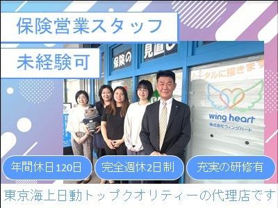 【アピールメッセージ】 当社は東京海上日動トップクオリティーの代理店です。 入社祝い金10万円支給(入社6ヶ月以上経過の方対象) 【既存顧客のフォローや契約更新業務】未経験OK 「未経験から、“トップクオリティー代理店”でプロへ。」 土日祝休み×残業ほぼなし。安定環境で、若いうちから一生モノのスキルを。 奈良県北葛城郡にある「株式会社ウィングハート」は、東京海上日動火災保険の保険代理店として、地域密着でサービスを提供。 さらに、同社が定める厳しい基準をクリアした**「トップクオリティー代理店」**として認定されています。 高い業務品質とお客様満足度が評価されている、信頼ある代理店です。 \保険営業スタッフ(正社員)募集!/ 既存のお客様へのフォローや契約更新手続き、新商品のご案内などをお任せします。 個人のお客様が中心で、新規開拓や飛び込み営業はほとんどありません。 ◆ 未経験大歓迎 入社後は東京海上日動の充実した研修制度あり。 保険知識や提案スキルを一から学べるため、営業未経験でも安心してスタートできます。 ◆ 働きやすさもトップクラス ・完全週休2日制(土日祝休み) ・年間休日120日以上 ・残業ほぼなし 「保険営業=忙しい」というイメージとは無縁。 メリハリをつけて働ける環境です。 ◆ 若いうちからスキルアップ 保険・金融の知識は一生役立つ専門スキル。 質の高い代理店だからこそ、正しい知識・提案力が身につき、市場価値の 高い人材へ成長できます。 未経験からでも、実力次第でしっかり収入アップが可能です。 “安心して長く働ける環境”で、“本物のスキル”を身につけませんか? ハローワークで求職中の方にもおすすめです。 少しでも興味をお持ちいただけましたら、ぜひご応募ください。