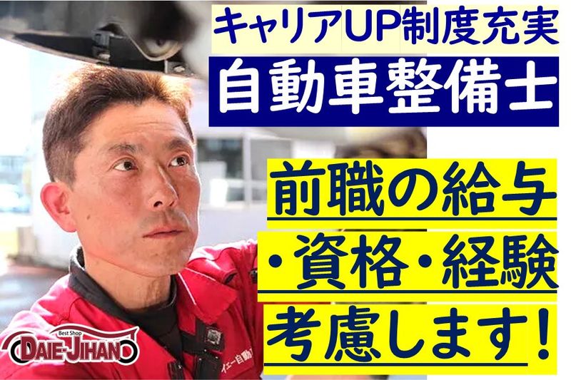 【仕事内容】 転職に対して不安なことお気軽にご相談ください! 業績好調・業務拡大のため自動車整備士(メカニック)募集! 前職の給与・資格・経験など考慮致します!収入UP・キャリアップ制度充実!技術UP研修充実!福利厚生も充実! ■具体的な仕事内容 主に国産の軽自動車から大型乗用車の車検・整備を行います。 ・タイヤ脱着や空気圧点検などの車検整備 ・油脂類交換 ・ブレーキ点検 ・清掃 ・測定 ・消耗部品類の交換作業 など ※個人スキルに合わせ段階を追って車検作業をお任せしていきます。 ●研修制度も充実 先輩スタッフが丁寧に指導やサポートしていくのはもちろん、「新入社員研修」や「現場研修」など、皆さんがスムーズに業務を開始し、 会社の一員として自信を持って成長していけるよう、各部署で様々なこと知識や技術を指導研修したり、 外部研修を活用してサポートしています。また会社の方針や価値観を共有するための勉強会も行なっています。 また、国産車から外車まで様々な整備・修理をすることができるのでスキルアップできます。 ●創業55年以上の安定企業 ダイエー自動車販売は鈑金塗装の修理実績が埼玉県行田市でトップクラスの専門工場です。 日本トレンドリサーチによる調査で、満足度7項目において第1位を獲得しました! 複数のメディアにも取り上げられ、街のみなさまに信頼される整備工場です! いきなりの応募が不安な方は、会社見学だけでもご連絡ください!働き方や待遇面のお問い合わせにもお答えいたします。 ぜひお気軽にご応募・お問合せください。 ■HPやユーチューブなどで、会社の規模や雰囲気を発信中! 「株式会社ダイエー自動車販売」で検索してチェックしてみてください!
