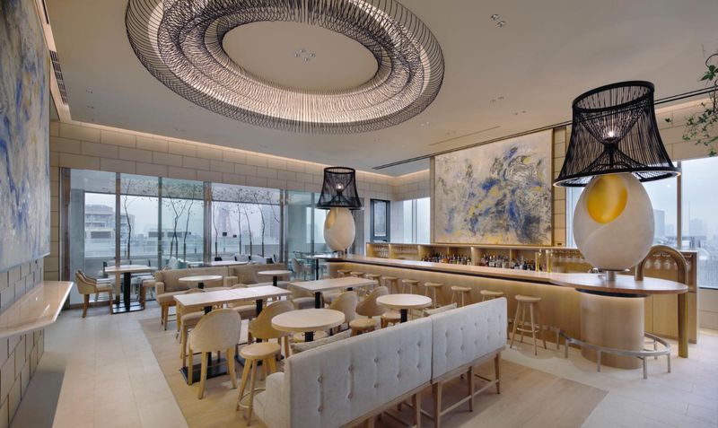 ホテル最上階レストランでの朝食ホールスタッフ