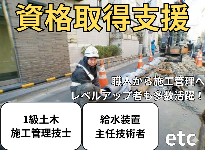 仕事内容 ✅おすすめポイント  ̄ ̄ ̄ ̄ ̄ ̄ ̄ ̄ ̄ ̄ ▷年収700万円以上を目指せます ▷年間休日130日!残業は基本なし◎ ▷現場は7~8名で対応します 【雇用形態】正社員 【仕事内容】水道管の公共水道工事の技術者 ”当たり前の生活を支える” ”なくならない仕事”だからこそ、 働く人にも”当たり前に”生活してほしい。 ………………………………………………… 東京都の公共水道管工事の 元請け・一次請けとして 水道管工事を手掛けている当社。 ▼今回の募集は… 経年劣化で古くなった水道管を 新しい水道管に取り替えるお仕事です。 ═══════════════ ⧉ 資格を活かして働けます ⧉ ═══════════════ 耐震性強化の需要拡大と 事業規模拡大につき作業員を増員募集! 東京都の公共事業を担うので、 案件数はこれからも安定✨ 関連資格をお持ちの方の募集ですが、 資格取得支援制度があるので さらならスキルアップも目指せます◎ 【現場】葛飾区・足立区・江戸川区など └八潮市に集合し車で現場へ向かいます -・-・-・-・-・-・-・-・-・-・-・-・-・-・-・-・-・-・-・-・- ✅作業の流れ  ̄ ̄ ̄ ̄ ̄ ̄ ̄ ●重機で先行掘削を行う └細かい場所はスコップを使用して掘削 ▽ ●古くなった水道管をハンマーで割る └「パートナーカッター」を使用して 切れ目を入れていきます! ▽ ●古い水道管を釣りあげて撤去する └同時に新しい水道管を配管します! ▽ ●道路の現状回復 └アスファルトやコンクリートで舗装します -・-・-・-・-・-・-・-・-・-・-・-・-・-・-・-・-・-・-・-・- ╭━━━━━━━━━━╮ ⧉ 先輩スタッフの声 ⧉ ╰━v━━━━━━━━╯ プライベートを大切にする社風のため、 仕事後はすぐに帰るスタッフが多いです。 基本的に残業はないので、作業後に 残ってなにかすることもないですし、 飲み会などがあっても自由参加です。 なので、そのあたりは気を遣わずに 仕事が終わったらすぐに帰って 自分のやりたいことに時間を使えます。 また、年間休日が130日もあるので、 先輩スタッフたちも仕事後や休日は 家族と過ごしたり趣味の時間にあてたり… 自分らしく過ごす時間を大切にしています♪ 日給が高く頑張りに応じた昇給もあるので、 安定して稼げるのも嬉しいポイントです。