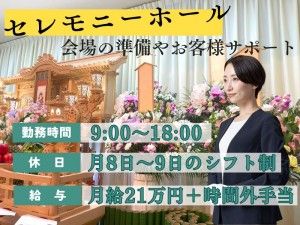 募集背景 業務増加による増員 仕事内容 \セレモニーホール・葬儀のアテンダントの募集です/ 【このお仕事の特徴】 ●未経験活躍中!セレモニーアテンダントのお仕事! ●途中入社50%以上!いくつからで始められる! ●月収21万~ 月8?9日休みでプライべーも充実! ●昇給.賞与年2回あり! ー---------------------- 【仕事内容】 セレモニーホールのアテンダント。 お通夜や葬儀の会場の準備やお客様サポートを行います。 慣れてきたら.お葬儀の進行も行います。 お通夜.お葬儀が滞りなく進行するよう.ご遺族様と葬儀担当者をサポートしていただきます。 【具体的には】 ・参列者に対しての接客 ・お別れのときにお花を配る ・祭壇の準備や片付け ・焼香の案内・お通夜.お葬儀の司会など 葬儀担当者と連携を取りながら仕事を進めていただきます。 ー---------------------- 【入社後は?】 お葬儀の流れを学び.まずは葬儀会場で案内係や会場準備などを行います。 ▼ 先輩社員と一緒に案内係の仕事からスタート。 ▼ 司会研修で司会業務を学んだ後は.司会を行なっていただきます。 一人で仕事が出来るように親切丁寧に.先輩社員がサポートするので未経験者もご安心ください。 ー---------------------- ●未経験活躍中● セレモニーの仕事は多くのスタッフが未経験から スタートしております。 セレモニーのアテンド業務に興味をお持ちの方. 新しいことにチャレンジしたい方.仕事内容を詳しく 知りたい方のご連絡もお待ちしております。 ●こんな人が活躍しています● 20代~40代の女性スタッフが多く活躍しています。 転職によりこの仕事に就いているスタッフが多いです。 途中入社のスタッフが90%以上在籍。 未経験でも丁寧にわかりやすくお教えします。 - このお仕事は【酒田エリアの求人です】 [醍醐味] 葬儀の案内や司会進行を通じて、お客様との関係性をきずいていくやりがいのあるお仕事です。 [厳しさ] 【社員関連】 [こんな人が活躍] 20代~40代の人と接することが大好きな女性が活躍しています。