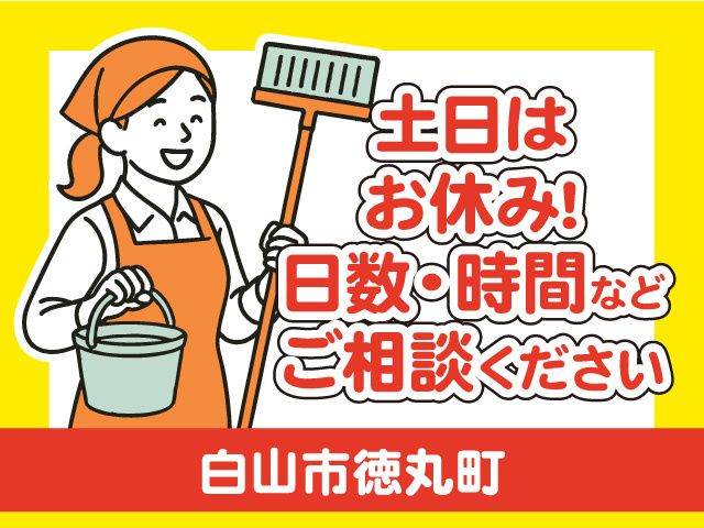 仕事内容 白山市徳丸町の企業内で 共用部清掃スタッフのお仕事です。 ◎月~金の週3~5日勤務! ◎1日3~5.5時間の日勤!土日休み! ◎時間帯ご相談ください 【お仕事内容】 玄関・応接室・食堂・喫煙室・トイレなどの 清掃をお願いします。 ※こちらの現場での勤務開始は11月1日からですが、 その前に数回、別の現場で研修を行う場合があります 【月曜~金曜の平日勤務】 月~金の間で週3日~5日、 1日3~5.5時間ほどの勤務です。 勤務日数、時間帯ご相談ください。 <未経験者大歓迎> 清掃業未経験の方も大歓迎です。 先輩スタッフがイチから丁寧に 指導いたしますので安心して お仕事スタートできます。 分からないことや相談事も しっかりフォローいたします。 <男女・年齢不問> 年齢・性別は問わず活躍しています。 子育てが落ち着いた方、 「運動不足を解消したい」 「お小遣い稼ぎをしたい」 「定年後の働き口として」 そんな方も多数活躍中です。 <アドバンス北陸サービスについて> 弊社の目標は、すべてのお客様に 満足していただくことです。 そのために、人材の育成に力を入れており 自己啓発にもつながっていきます。 快適な空間づくりや清掃を通じて 人間力も一緒に磨いていきませんか? まずはお気軽にお問い合わせください。