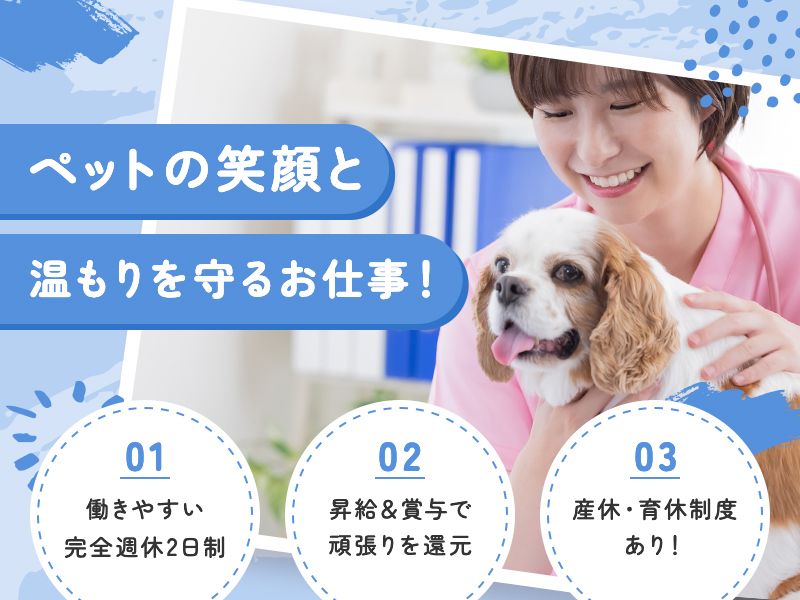 仕事内容 +・・・・・・・・・・・・・・・・・・・・・・・・・・・・+ \有資格者歓迎/ 連携を大切にしたチーム医療で 動物たちの健康を守りませんか? ✨2027年度の募集です✨ +・・・・・・・・・・・・・・・・・・・・・・・・・・・・+ ・-・ 求人の魅力をCHECK ・-・ ♢完全週休2日制の働きやすさ ♢産休・育休あり!子育て世代安心 ♢嬉しい賞与は年2回しっかり支給 ♢住宅手当&資格手当を給与に上乗せ ♢アットホームで風通しの良い職場環境 ・-・-・-・-・-・-・-・-・ ~~~~【仕事内容】~~~~ 獣医師、看護師が密に連携し、 患者様とご家族をトータルでサポートする チーム医療を実践しています。 その一員として幅広い業務をお任せします。 <具体的には> *診療補助(犬・猫) *調剤補助 *受付・接客 *電話対応 *院内清掃 など <詳細> 診療:一般:6~7割 専門:3~4割 最先端の獣医療設備投資に積極的! ・手術装置 ・レントゲン装置 ・内視鏡 ・超音波装置など ~~~~~~~~~~~~~~ 完全予約制です。 ご家族に寄り添う姿勢を大切にし、 動物たちと向き合っています!