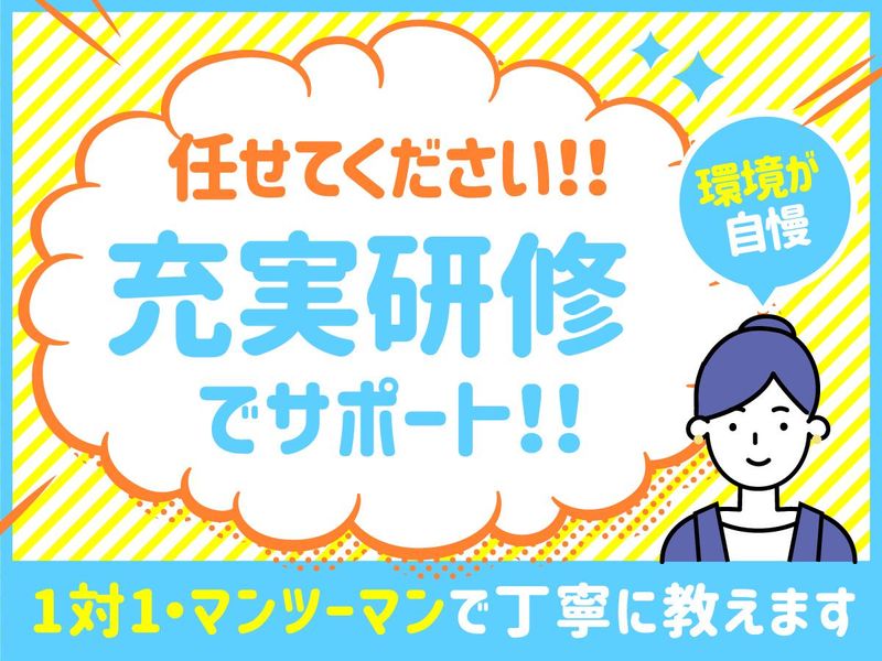 試用期間あり 試用・研修期間:2週間(習得状況により前後する場合あり) 試用・研修期間の条件:本採用と同じ <研修> 随時開始 ※開始日は面接時にご相談ください。 研修は1対1のマンツーマン形式で実施するため、質問もしやすく自分のペースで習得できます。入社後数年経過してからでも、業務内容で不明点が出てきた場合には再度研修を受けられる手厚いサポート体制が整っているので安心◎何か困ったことがあれば、組織全体で改善に向けて全力で取り組んでくれるので、長く安心して働ける環境です*
