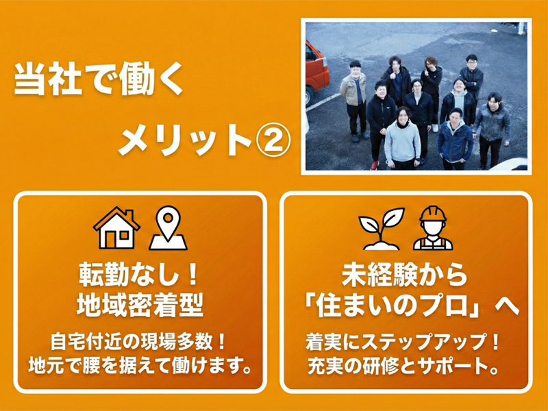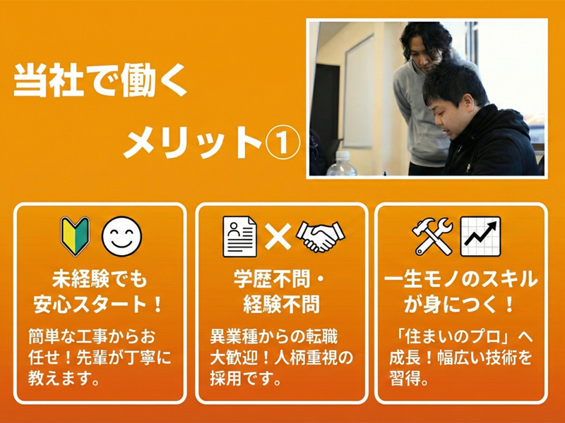 求める人材: \学歴不問!未経験大歓迎です/ 先輩たちの8割以上が未経験スタートです! 【必須条件】 〇 普通自動車免許(AT限定OK) 【こんな方にぴったりです】 〇 安定した環境で長く働きたい方、手に職をつけたい方 〇 住宅や建築に興味がある方(知識や経験は問いません!) 〇 DIYなど、手を動かすことが好きな方 〇 チームワークや仲間を大切にできる方 〇 ゆくゆくは独立にも興味がある方 【こんな経験があれば活かせます(※必須ではありません)】 〇 不動産業界の経験(不動産管理、メンテナンスなど) 〇 施工管理の経験 〇 営業や販売・接客など、人と接する業務の経験