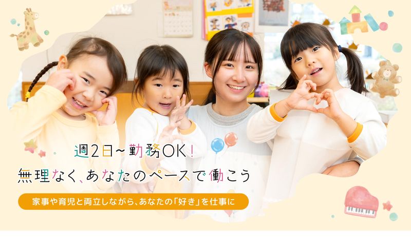 必要資格・経験 <必須> ●保育教諭の業務経験(経験年数不問) ●保育士資格・幼稚園教諭免許の どちらかを取得されている方 ●子どもが好きな方 <歓迎> ●週3日以上出勤できる方 ●1日8時間勤務できる方