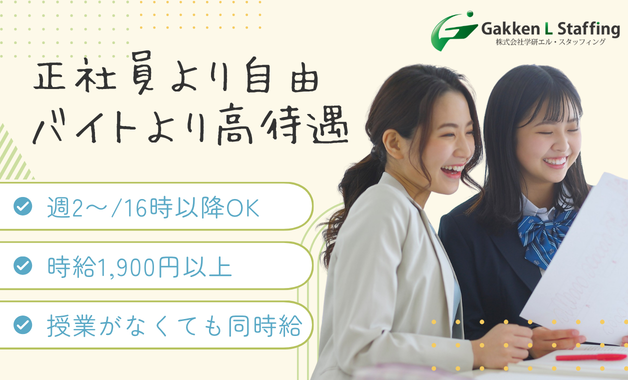 お仕事内容 【具体的な業務内容】 ■小中学生の集団授業 ■小テストの作成・採点 ■授業後の保護者面談・対応 ■得意な1教科からOKです! 指導対象は小学生~中学生で、 教える生徒の学力も様々です。 あなたの得意な教科を中心に教えられるので、 チャレンジしやすい環境が整っています。 ■成長を届けるお仕事です! 生徒の「わかった」「できた」を支える仕事です。 「人に教えることが好き」 「成長を見守ることが好き」 そんな想いをお持ちの方が活躍しています。 ■時給は未経験でも1,900円スタート! 学研グループのノウハウを基に指導ができます。 塾の先生は未経験…という方でも、 高時給の1,900円でスタート可能。 あなたのプレゼンスキルを磨きながら、 しっかりと収入につなげることができます。 【職場環境】 ■30代以下の方大活躍中です! ■未経験からのスタートでも大丈夫! ■講師同士で教えあえる、 チームワーク抜群の職場です!