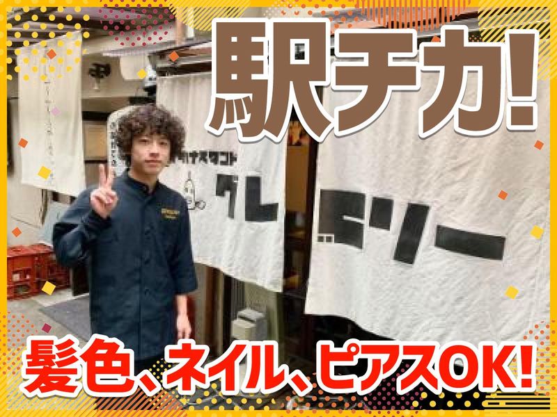 仕事内容 \2026年の新メンバー大募集!/ 今年は卒業スタッフが多く、ほぼ新メンバーで新年度を迎える予定! 卒業スタッフが安心して、卒業できるように一緒に働いてくれるメンバを大募集♪ 卒業まで頑張ってくれたメンバーがいなくなるのは寂しいですが、 新メンバーでドンドンお店を盛り上げていきたいと思います! 卒業までに先輩スタッフが丁寧にお仕事を教えるので安心してくださいね♪ 「卒業までゆったり働きたい」 「大学生を楽しみたい!」 「初バイトでもできそうな仕事をしたい」 という方、お気軽にご応募ください♪ ୨୧‥∵‥┈┈┈ POINTS ┈┈┈‥∵‥୨୧ ✅髪色、ネイル、ピアスOK! ✅月15日以上で”皆勤手当”あり! ✅”セルフオーダー”なのでカンタン! ✅11時以降も勤務できる方優遇◎ ୨୧‥∵‥┈┈┈┈┈┈┈┈┈┈┈‥∵‥୨୧ 主な業務は ・お客様の席案内 ・ドリンク、料理の配膳 ・レジ業務 など… お客さんにQRコードを読み込んでもらう ”セルフオーダー式”なので 注文対応はほぼありません! ▼長時間勤務の人にはまかないも♪▼ まかないはその日によって変わります。 店長が沖縄に行った時はアグー豚を使って サムギョプサルを作ったことも! ▼しっかりとサポート体制あり▼ はじめは、 宅番を覚えてもらって ”いらっしゃいませ”と言えたらOK! ドリンクもひとつひとつ教えます。 レシピ帳も隣においてあるので、 忘れても見返せます! もちろん、分からなければ 気軽に聞いてくださいね! ▼スタッフの声▼ 気づけば…もう4年も働いていました。 (くるくるパーマの20代男性スタッフ) 髪色・ピアスで自分らしく働こう! 過去には髪色青色のスタッフがいたことも!