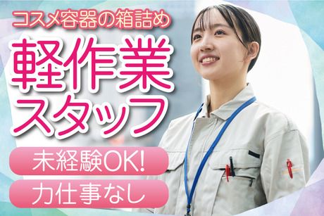 仕事内容 【 おすすめポイント♪ 】 ★重たいものナシ!サクッと覚えられるシンプル作業♪ ★朝から夕方までの勤務で、生活リズムも安定! ★残業なし&土日祝休みなので、家事や育児との両立も◎ ★車&バイクでスイスイ通勤OK♪無料駐車場も完備! 【 お仕事内容♪ 】 コスメ容器を扱う軽作業スタッフ ▼お任せするのは… ・キャップを「カチッ」と閉めるだけ! ・シールを「ペタッ」と貼るだけ! ・箱に「サッ」と詰めるだけ! シンプルな作業ばかりなので、すぐに覚えられます◎ 未経験の方や、久しぶりのお仕事復帰の方も大歓迎! 最初に丁寧なレクチャーあり♪ 作業マニュアルもあるので、迷わず進められます! ひとりで集中できる環境だから、気疲れしにくい! 「モクモク作業するのが好き」という方にオススメ♪ 重い荷物を持つことはなく、体にやさしい作業ばかり♪ 無理なく続けられるから、長く働きたい方にぴったり! 【 勤務先のご紹介♪ 】 化粧品・家庭用品などの OEM(受託製造)を行うメーカー企業。 OEMに特化しているため、他社のブランド製品を 年間1200種類以上製造する、裏方のプロフェッショナル☆ 20代・30代・40代の女性が中心に活躍中! 主婦さんや子育て中のママさんも多数在籍。 家事・育児と両立しながら働ける環境です◎ 空調完備&衛生管理もバッチリ! 清潔感のある工場で安心してお仕事できます。