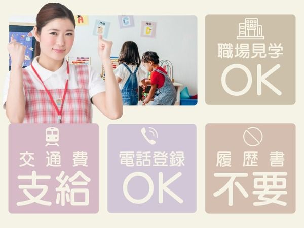 仕事内容 【 職場について 】  ̄ ̄ ̄ ̄ ̄ ̄ ̄ ̄ ̄ ̄ ̄ ̄ ̄ 奈良県生駒郡三郷町にある幼稚園です。 経験年数が少ない方も活躍中です! 「前の職場に馴染めず早期退職してしまった…」 「園での経験は数か月しかない…」 そんな方も歓迎いたします。 【 業務について 】  ̄ ̄ ̄ ̄ ̄ ̄ ̄ ̄ ̄ ̄ ̄ ̄ ̄ ◎お仕事内容 ・子どもの受け入れ ・ミルクやおやつの準備 ・お昼寝の準備 ・リズム体操 など 経験が浅い方や、ブランクがある方も歓迎! 資格があればOKです♪ ◎おすすめポイント ・交通費全額支給 ・給与日払い制度があるので、急な出費にも安心 ・入社前の職場見学も可能なので、安心してスタートできます
