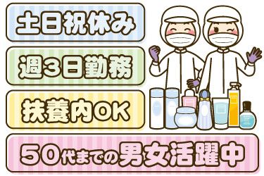 仕事内容 <新着/コスメ製品の簡単軽作業!> \未経験者大歓迎/ コツコツモクモク取り組める 簡単な軽作業なので 工場でのお仕事が初めての方も安心◎ 髪自由・タトゥーOKで、 オシャレも楽しみながら働ける職場です。 現在は20代・30代・40代・50代の 男女スタッフが活躍中! \働きやすい勤務形態/ 日勤勤務で16時過ぎには終業、 土日祝休みの週3日勤務で 働きやすいお仕事です。 「扶養内で勤務希望」 「子供が学校から帰ってくる前に帰宅したい」 「少ない日数で無理なく働きたい」 という方にもオススメです! 扶養内勤務OKで曜日選択も可能ですので 勤務日数等お気軽にご相談ください。 【ポイント】 ・日勤勤務で土日祝休み ・週3日勤務 ・扶養内勤務OK ・学歴不問 ・髪自由、タトゥーOK ・主婦パートさんも活躍中 ・若手から中高年まで活躍中 【詳しいお仕事内容】 化粧品・コスメの充填包装工場での軽作業です。 具体的には... ・化粧品の包装作業 ・仕上げ作業 ・箱折り作業 などを行っていただきます。 未経験から始めた方も多数活躍しています! 「製造業のお仕事は初めて」という方へも 社員や先輩スタッフが一から教えますので 安心して始められる環境が整っています。 ・未経験から挑戦したい! ・正社員として工場内作業員の経験がある ・倉庫内での仕分けパートやピッキングアルバイトの経験は活かせるかな? ・土日祝休みの仕事を探していた ・接客業や事務などの異業種から転職を検討中 ・家庭と仕事を両立できる環境を求めていた ・家から近い場所で勤務したい ・コツコツモクモク作業が得意! ・コスメや化粧品が好き! ・ハローワークで製造業の仕事を探していた という方も大歓迎です! 【勤務地について】 鴻巣市三ツ木の工場が勤務地になります。 北鴻巣駅より車で約5分! 車(マイカー)・バイク通勤OKです。 国道17号線沿いなので近隣市町村からも 通いやすい立地です。 ◎職場見学できます! ◎出張面接致します ◎面接日や入社日・勤務開始時期の相談もOK! 気になる点やご不明点等も お気軽にお問い合わせください。 お電話または応募フォームよりご連絡ください。 <電話応募・お問合せ先> TEL.04-2940-0800 (受付/9時~17時)
