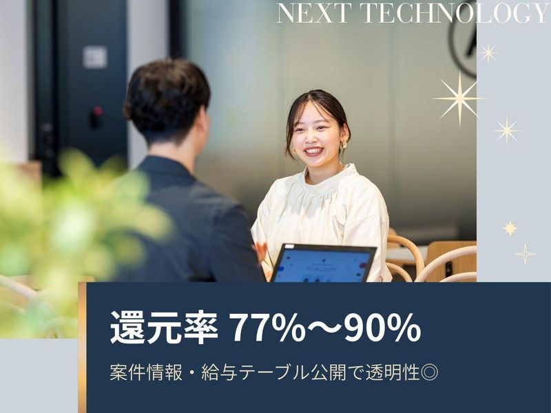 仕事内容 ー 理想の働き方が叶う場所 ー ★1. 働く場所自由 - フルリモ制度あり ★2. 還元率最大90%! 給与テーブル公開 ★3. 案件情報全開示、自由に選択可能 ★4. 残業月平均11h/年休135日/副業可 ★5. Udemy,外部講師研修スキルアップ支援◎ ※詳細は下記、【アピールポイント】へ <具体的な業務内容> 情報技術に関する専門的なスキル・知識を活用し、システム開発やITインフラの設計・構築・運用を行います。 <案件例> ■AIエージェント開発 工程:要件定義~テスト 環境:Python,TypeScript,React,Next.js,Node.js,GO,Kubernetes,Terraform,AWS ■電子コミックサービス開発 工程:設計~テスト 環境:TypeScript,React,Node.js,JavaScript,PHP,AWS ■次世代ブロックチェーンサービス開発 工程:設計~テスト 環境:GO,GCP,iOS,Android,Swift *今後は受託開発や自社サービスにも力を入れていきます! …………………………………………… \ アピールポイント / 【1】全国どこからでも好きな場所で働ける 「子育てと両立」「慣れ親しんだ土地で」 など生活に合わせて選べます。 <リモート割> フルリモート52%,ハイブリッド18% ,フル出社30% 【2】全員が年収UPを実現しました! 経験やスキルに合った正当な評価で 年収UPに繋がってます。 単価連動性で給与テーブルを公開し、 最大還元率は90%!透明性も◎ 【3】案件情報全開示、自由に選択可能 単価/内容/期間など、案件情報は全て開示。 「興味のある案件へ」「スキルに合わせて」 などの希望に合わせ自由に選択ができます! 【4】残業月平均11h/年休135日/副業可 働きやすさバツグン! 社員の声を基に福利厚生を日々アップデート。 ★服装自由 ★フリードリンク完備(生ビールも!) ★全てのオフィスが駅直結 【5】スキルアップ・サポート充実 動画学習(Udemy) や、外部講師を招いたAI勉強会など、社内の声から実現した制度も!常に学べる環境を用意。 経験が少ない技術領域に挑戦する際には、経験豊富な先輩エンジニアとともに案件に入ることも可能です! …………………………………………… 当社の魅力についてもっと知りたい方は、 下記URLをチェック! ◆note(社員インタビューあり) https://note.com/nexttech/ ◆Qiita https://qiita.com/organizations/nexttechnology/profile ◆採用HP https://nexttechnology.jp/recruit/ ◆広報 https://x.com/NextTechPR ◆社長SNS https://x.com/wadagaku