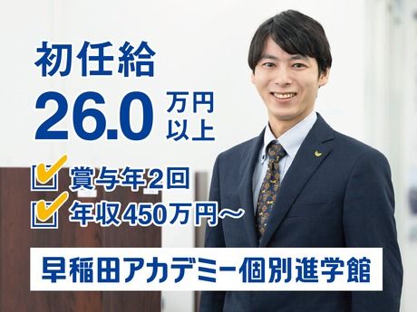 仕事内容 ◆成長性も、業績もトップクラスの環境で。 教育業界ご経験者は高収入スタートも! 【1年以内で校長職昇格実績有】 より高レベルな環境で教育に携わりたい。 実力に見合ったキャリアを手にしたい。 そんな方の本気の熱意に、 最適なフィールドがここにあります。 営業面の指標だけでなく、 合格実績や通塾満足度などの指標でも 評価しているため、教務面でも しっかりスキルアップしていける環境です。 ぜひ一緒に、子どもたちのための未来を創りませんか? 【自らの力で「未来」を切り拓く】 受験勉強は人生における通過点の一つに過ぎません。 それでも、そこで得られる強い精神力や高い学力、 問題解決能力は、将来必ず役に立つ「武器」になります。 そこに至るためには、「本気」で物事に取り組み、 「自立」することが必要になります。 早稲田アカデミー個別進学館では、 真剣に学習することを通して、 「自立」した子どもたちの育成を目指しています。 目標とする難関校への合格を第一に考え、 現在の学力に関わらず、生徒一人ひとりに合わせた 指導・サポートを全力で行っています。 子どもたちが自らの力で未来を切り拓いていけるよう、 しっかりと成長を支えることが 私たちの責務でもあります。 ◆校長候補として塾の数値管理や人材マネジメント、保護者・生徒対応などをお任せします。 個別進学館の校長候補として、個別進学館校舎で勤務いただきます。 【募集背景】 2027年までに個別進学館を100校体制とする 中期経営計画を開示しております。 今後の早稲田アカデミーのさらなるブランド強化と 将来の日本を背負う子どもたちのために、 個別進学館の校長候補を募集します。 【主な仕事内容】 ・進路相談等の生徒・保護者対応 ・授業前後の生徒対応 ・問合せ対応 ・保護者との定期的な情報交換・アドバイス等 ・授業 【校長へのステップアップ後】 数値管理や人材マネジメントなどを通じて、 合格実績・保護者や生徒の満足度向上を目指していただきます。 校長→エリア長→次長→部長 \\塾講師の魅力・やりがいこちら// https://www.honkoe.com/ 「塾講師という職業」の魅力を紹介するWEBサイトの 制作に当社が全面協力をいたしました。 当社の社員の働き方ややりがい、 インタビューも掲載されておりますので、 ぜひご応募前にご覧ください。