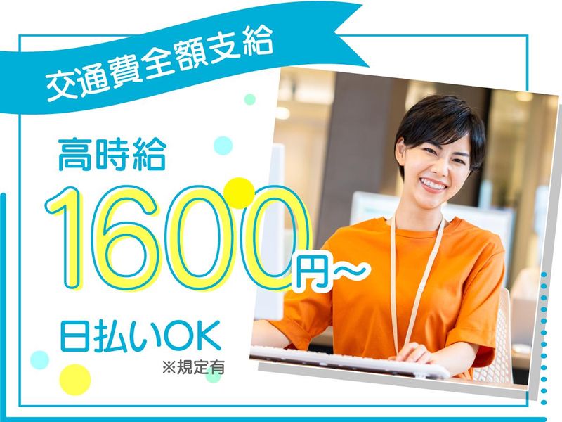 時給1,600円以上 給与詳細 基本給:時給 1600円 〜 ※交通費全額支給 日払いOKで、即収入GET! 【給与例】 給与例 【週4日】 時給1600円×1日8h×月16日 =月収20万4800円 【週5日】 時給1600円×1日8h×月22日 =月収28万1600円 ※上記目安金額となります。
