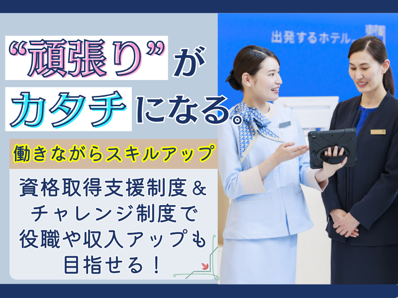仕事内容 「今までの仕事って、 なんであんなに毎日バタバタしてたんだろう。」 出勤、残業、帰宅、寝る、のくり返し。 気づけば週末もぐったりで、 旅行もライブも習い事も後回し。 でも、今の働き方なら── 2日働いたら【2連休】のサイクル。 「ゆとりのある毎日がこんなに心地いいなんて」 そう思えたこの環境で、 自分の時間とキャリア、どちらも取り戻しました。 ✨━━━━━━仕 事 内 容━━━━━━✨ 宿泊でお越しのお客様の チェックイン・チェックアウトを含む フロント業務を中心にご対応いただきます。 「おかえりなさいませ。」 「いってらっしゃいませ。」 と元気に挨拶をしてお客様を 笑顔にするお仕事です! ✨━━━━━━━━━━━━━━━━━✨ ⭐翻訳機あり!外国のお客様対応も安心⭐ 「ホテルって英語いるんじゃないの?」 その心配、いりません! 実は、翻訳機があるから 外国人対応もスムーズにこなせます! 接客はほとんどが日本語。 語学よりも“笑顔”が大事なお仕事です♪ ⭐プライベート優先が“当たり前”になる⭐ 推し活・旅行・資格取得… “自分のために使える時間”がたっぷり。 「休みたい」って言いにくい空気、ここにはありません。 有給使用で、6日間の長期連休も◎ スタッフ想いの支配人と 風通しのよい職場なので、シフトの融通も◎ ⭐正社員で月給21万円以上+賞与あり⭐ 週2日程度の勤務でも、 きちんとした収入があるから生活も安心。 福利厚生も充実♪ 産休・育休を取得して復帰したスタッフも多数! 結婚・出産後も長く働ける安心の制度&実績あり♪ ⭐スキルアップ×手当でモチベもUP!⭐ 「資格、取ってみようかな」その気持ちを応援! 取得した資格に応じて、毎月手当を支給◎ 成長もお給料も、ちょっとずつ増え、 働くモチベーションもUP↑↑