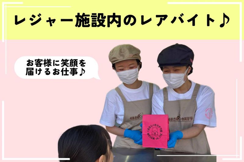 仕事内容 短期アルバイト募集★ 主婦(夫)さん・学生さん活躍中◎ \\土日祝メイン・1日5h~OK◎// もちろん長期もOK☆ 遊園地・動物園の人気店◎ 笑顔あふれるカステラ屋さんで働こう! • ───── ୨୧ ───── • 可愛い&おいしい✨ カステラ販売をお任せ◎ • ───── ୨୧ ───── • お任せするのは当社自慢のキュートな 「くまカステラ」の接客・販売が 中心となります。 店頭実演販売なので、お客様の 「可愛い!」「すごーい」の 歓声に嬉しくときめく毎日です♪ 【 仕 事 内 容 】 *…*…*…*…*…*…*…*…*…* 1日の業務は3~4人で行っています。 お客様の前での実演販売となります。 目の前でのカステラの 焼き上げまで美味しい香りと共に提供! まるでショーを見ているかのような、 ワクワクする体験をお届けしてください◎ ⭐メイン作業:販売・接客 *お客様のご案内 *会計 *商品の提供 など 【 ポ イ ン ト 】 *…*…*…*…*…*…*…*…*…* ✅毎日が特別な非日常ステージ! 動物園・遊園地があなたの職場です。 出勤するたびに心が躍る、特別な空間。 仕事を通じて、自身もワクワクしながら 働けるのが最大の魅力です。 ✅「可愛い!」「美味しい!」が直接届く お客様の食べた瞬間の満面の笑顔が、 ダイレクトに届くのが実演販売の醍醐味◎ 感動と喜びに満ちた、やりがい溢れる瞬間に 毎日立ち会うことができますよ★ ✅あなたの成長が、すぐに給与に直結! 未経験の方も大歓迎!安心してスタート できるよう、充実したフォロー体制を ご用意しています。経験を積み、スキル がアップすれば、すぐに時給もアップ! 頑張りをしっかり評価し、報酬に還元 します◎ さらに、繁忙期には特別手当も別途支給! ✅学校やご家庭との両立もしやすい! 土日祝勤務がメインとなりますが、 シフト制なので柔軟に対応いたします◎ ライフスタイルに合わせて働けます。 ~*~*~*~*~*~*~*~*~ 最高の思い出を作りに来園されるお客様を 最高笑顔でお迎えして、カステラのように 心あたたまる接客を提供していきましょう!