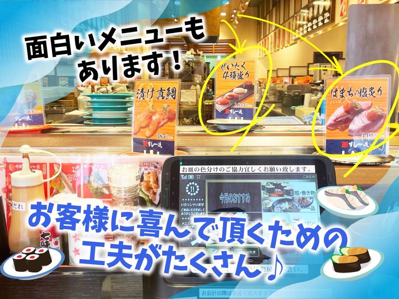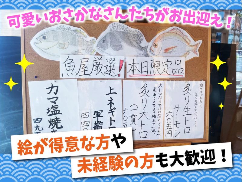 仕事内容 ✅Check >>============= *週1日、1日3h~OK! *特にディナーの時間帯を大歓迎! *お寿司が割引価格で買える! ┗まかない30%OFF! ┗家族で食べに来ても20%OFF! *プロ野球観戦チケット抽選あり! *履歴書不要でサクっと面接! ================== すし一流でホール・キッチンのお仕事! <ホール> ◆お席へのご案内 ◆料理・ドリンクの提供 ◆お会計 ◆テーブルセッティング ◆店内の簡単な清掃 など <キッチン> ◆メニューの調理 ◆仕込み ◆盛付け など ★慣れてきたらお寿司の握りなどもお任せしていきます! 自分でお寿司が握れるようになればちょっと自慢できるかも!(^^)! *・・・*・・・*・・・*・・・*・・・*・・・*・・・ 【* 時間を有効に使おう *】 勤務は週1日、1日3h~OKです! 特に18時~23時に入れる方を大歓迎! だからこんなあなたにピッタリ▶▶▶ ★学生さん ・夕方の授業終わりに! ・部活やサークルが終わってからバイト! ・夕方まで家でのんびりしたい! ★フリーターさん ・夕方に終わるバイトとかけもちしたい! ・時間の融通の利く仕事を探している! ・今やっているバイトと違うジャンルの仕事がしてみたい! ・将来のためにいろんなスキルを手に入れたい! …シフト申告は1週間毎! 「直前まで予定が決まらない」そんなあなたには超便利! 学生さんの時間割やテストの都合なども考慮します! *・・・*・・・*・・・*・・・*・・・*・・・*・・・ 【* 従業員割引が超絶魅力的♪ *】 当店の従業員割引は「お寿司」です! ふだんなかなか食べられない人は注目! お得な価格でお寿司が食べられます! お家に買ってかえって家族みんなでお寿司の日! 学校の友達を集めて豪華お寿司パーティー! なんて夢も叶っちゃいます! ★毎日競りに出されるまぐろを買い付けてくるなど素材にはしっかりこだわり、味は超一流!「回転寿司だけど本当に美味しい」と評判のお店です! ★野球好きなあなたは 抽選でプロ野球観戦チケットが当たるチャンスも! *・・・*・・・*・・・*・・・*・・・*・・・*・・・ 【* こんなあなたも大歓迎 *】 ◎飲食店で働くのが初めて! ◎バイトするのが初めて! ◎お寿司が好き! ◎楽しい職場でバイトしたい! ◎限られた時間を有効に使いたい! ◎自分の都合を優先できるバイトがしたい!