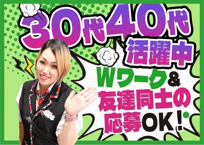 職場環境 \出張面接OK!/ **男女Staffが活躍中** 20代・30代・40代・50代が活躍中! 時間調整もしやすい職場なので安心◎ Wワークや家庭との両立もらくらく♪ ★1日5h~・週3日~OK! ★土日祝入れる方歓迎♪