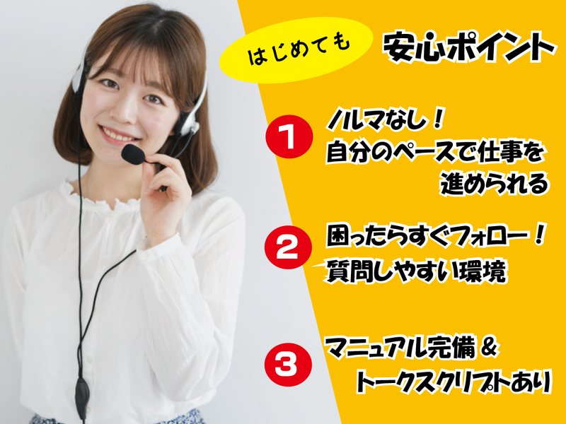 求めている人材 \✨20名以上の大募集✨/ 「一緒にスタートする同期が多いから、安心感が違う!」 教え合い・励まし合える環境で、楽しみながら成長できます。 ================= ◇必須条件はとくにありません!◇ ================= 経験者も未経験者の方も大歓迎! 学歴・経験・職歴は一切問いません。 「人と話すのが好き」「オフィスワークに興味がある」 そんな気持ちがあればOKです✨ 《こんな方にピッタリ!》 下記のうち、ひとつでも当てはまる方はぜひご応募ください♪ ■丁寧に人と接するのが好きな方 ■オフィスワークデビューしたい方 ■コツコツ作業よりも、人と話す仕事が向いている方 ■同年代の仲間と楽しく働きたい方 ■チームで協力しながら仕事を進めたい方 ■自分の希望に合わせてシフトを調整したい方 《活躍しているスタッフの前職》 カフェ・アパレル・居酒屋などの販売・接客 コンビニ・ホテル・美容・ネイルサロン・エステ 電話受付・事務・カスタマーサポート・コールセンター テレアポ・インサイドセールス・営業アシスタント など 接客・販売など、人と関わる仕事の経験が活かせます♪