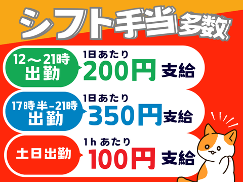 時給1,350円以上 給与詳細 基本給:時給 1350円 〜 ・交通費全額支給(規定あり) ・各種シフト手当あり ✅出勤手当:200円/日(12:00~21:00勤務) ✅夕方シフトイン手当:350円/日(17:30~21:00勤務) ✅土日出勤手当:100円/h ・高収入 ・高時給 【給与例】 給与例 ⭐12:00~21:00×土日勤務の場合⭐ 1日あたり1万2150円 =時給1350円+100円/時×8時間+200円/日+350円/日 ⭐平日8時~17時勤務の場合⭐ 1日あたり1万800円 =時給1350円×8時間