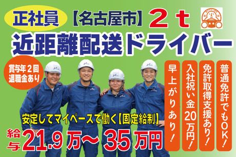 仕事内容 【仕事内容】 2t平ボディートラックに乗っていただき、 大手石膏ボードメーカーの製品の配送をお願いします! 配送先は、ビル、マンション、住宅、 建設現場への輸送、及び工務店、材木問屋、 ホームセンターなどになります。 ■配送エリア:名古屋市近郊(愛知県内) ■車両:2t平ボディー ■積み降ろし方法:フォークリフト積 手卸・フォークリフト卸・レッカー卸(配送先により異なる) ■取扱商品:石膏ボード 【おすすめポイント】 ★入社祝い金あり! ★物流業界未経験の方も大歓迎! ★20~40代の方活躍中! ★深夜・日跨ぎの運行無し!夕方には退社でき、 自分の趣味やご家族との団欒の時間も作れます。 ★固定給があるので非常に安定しています! ★賞与年2回・昇給あり ★基本一人一車制(空き車両に乗り換え有) ★夏季・年末年始大型連休有 ★デジタコ・ドラレコ・バックモニター全車搭載! ★「働きやすい職場認定制度」の二つ星を獲得している企業です! ★アットホームな雰囲気の会社! 名古屋市、一宮市、小牧市、豊田市などから 通われている社員さん在籍中! 【未経験の方でも活躍出来ます!】 各営業所にて座学研修や適性診断の実施など 充実した研修制度を整えています。 先輩ドライバーによる丁寧な同乗指導なども ありますのでご安心ください! 【創業60年のトーショーグループに関して】 1964年の創業から60年と長く安定している業界有数の運送会社です。 全国各地で事業を展開。 現時点でグループ全体で34拠点を有し、社員数は800名以上。 大手荷主とお取引が多く、取り扱う商材等の関係から仕事量が安定しています。 また物流だけでなく、旅客や引っ越し、 保険・物販といった多種多様な事業も展開しております。 ≪転職を迷っている方も気軽にご相談ください!≫ ※お車での来社もOKです。 ※お電話での応募も大歓迎! 【ユニフォームを全面リニューアル!】 著名なセレクトショップ「ビームス」の ユニフォームブランド「ユニフォーム サーカス ビームス」が製作を手掛け、 機能性と耐久性を兼ね備えた高品質なユニフォームが完成しました。