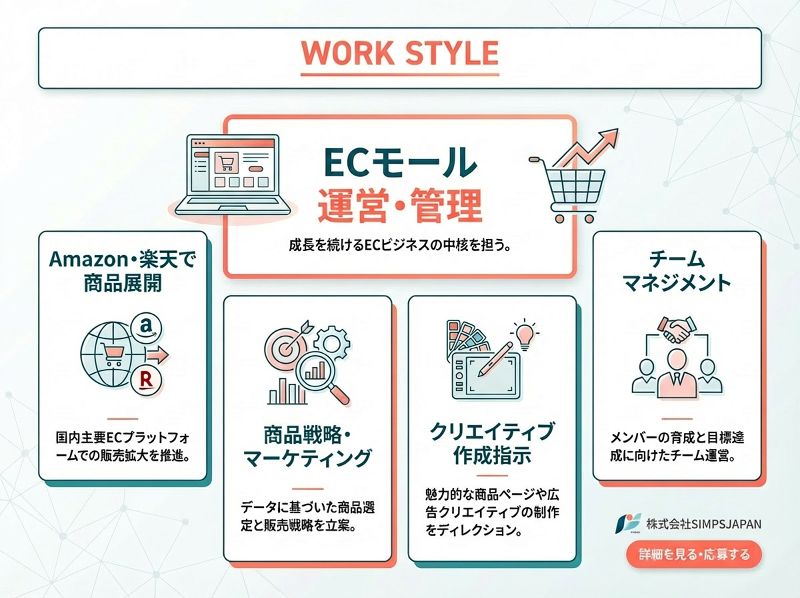 アピールポイント: 【責任者!高井からのメッセージ】 少しだけ聞いてください!!! 初めまして。 取締役をしております「高井」と申します。 当社のような小さい会社を選んでくれた以上、私は社員に成長してもらう責任があると考えています。 「SIMPSJAPANで働いていた経験があって良かった!」「SIMPSJAPANで働いていて楽しい」と思ってもらえるように頑張ります! 「目の前のことを真剣に!」「仕事を真剣に!」「勉強も真剣に」「成長も真剣に」「休みも真剣に」 全てのことに真剣に向き合ってもらえるように私も全力でスタッフに向き合います。 その結果、お客様に喜んでもらいましょう。 私たちはAmazonを軸に5000種類ほど商品を展開する成長企業です。 EC運営だけでなく、商品企画・ブランディング・業務改善まで一貫して手がけています。 当社の特徴は「平日は本気で働き、成果で評価し、休むときはしっかり休む」文化です。 年間休日は140日。土日祝・大型連休はすべて休み。一方で、平日の業務はスピードと責任を重視しています。 未経験スタートでも成果次第で年収600万円以上を狙える環境があり、実際に入社1年以内で月給40万円・年収560万円に到達したメンバーもいます。 将来的には幹部・事業責任者として、年収1,000万円以上を目指すキャリアパスも用意しています。 現在は少数精鋭のチームで、一人ひとりが大きな裁量と責任を持って働いています。 単なる作業者ではなく、事業を一緒に創る仲間を求めています。 楽な仕事を探している方には向きません。 本気で成長し、自分の市場価値を高めたい方には、これ以上ない環境です。