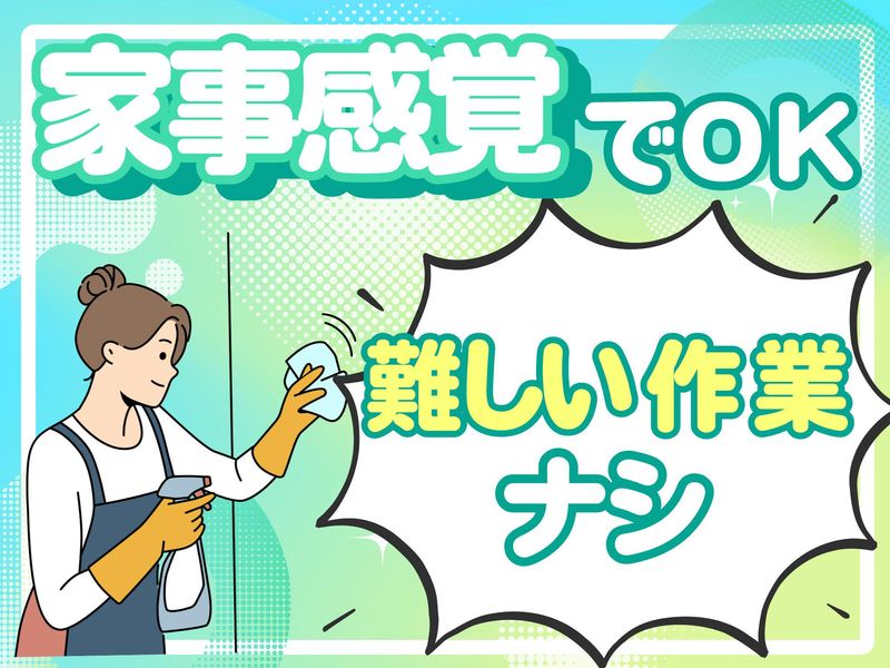 求めている人材 //////////////////////////////// 未経験大歓迎!! 誰でもできちゃう簡単清掃** //////////////////////////////// \\ 年齢不問! // 子育て中の主婦さんから お仕事にブランクのある方、 ミドル・シニアの方まで 幅広い年代の女性スタッフが 活躍中の職場です! \\ こんな方にオススメ! // 「定年後、まだまだ働きたい!」 「お仕事復帰したい!」 家事などと両立もしやすい(・u・)ノ