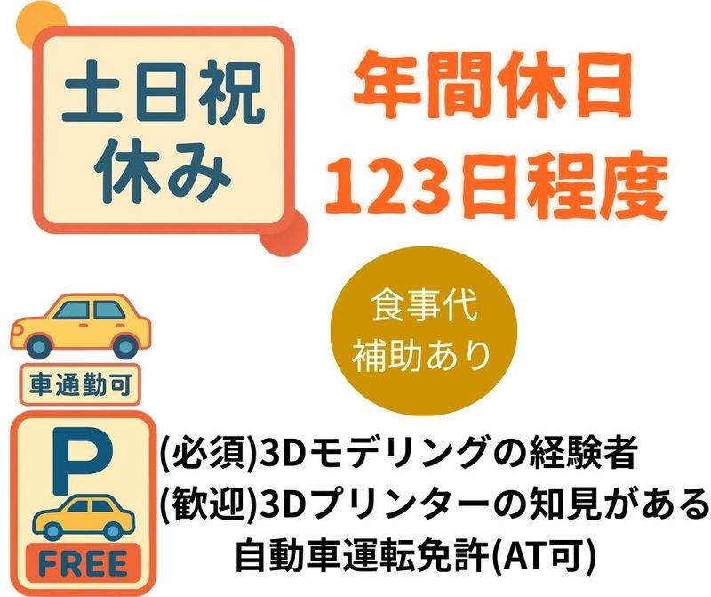 資格 【必須】 ■3Dモデリングの経験者の方 ■高卒以上 【歓迎】 ・3Dプリンターの知見がある方 ・自動車運転免許(AT可) 既卒・第二新卒歓迎 フリーター歓迎 主婦・主夫歓迎 ブランクOK