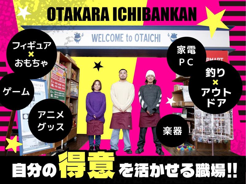 仕事内容 \ (●'▽')σアピールPOINT / ⏩「好き」を活かして働ける! ⏩ 気の合う仲間との出会いあり! ⏩ 服装&髪自由!個性派大歓迎! ⏩ 気になる商品は社割でGETも可! ⏩ シフト自由◎働き方は自分次第! ⏩ 土日祝は時給200円UPでお得! ⏩ リサイクルショップ未経験歓迎! ⏩ 毎日楽しく働ける!活気あるお店♪ - ―――――――――― ■仕事内容について ――v――――――― アニメグッズ/フィギュア/ゲーム/ 楽器/アウトドア/PC・家電/アパレル などなど…様々なジャンルに分かれた 売り場にてリユース商品の販売や接客、 売り場づくりをおまかせします。 ┌✨―――――┐ | 具体的には | └―v―――✨┘ □レジ □接客 □商品陳列 □POP作り □機械メンテナンス □商品撮影 □WEBサイト管理 □商品の梱包 □発送準備 □商品の査定・買取 □バックヤードでの商品搬入や整理 etc ⭐仕事は多岐に渡りますが 全てをお任せするわけではありません! ⭐「得意な業務」や「好きなジャンル」を 考慮してお仕事をおまかせします! ⭐「得意」を活かして活躍できる環境! ――――――――――― ■こんなお店です♪ ――v―――――――― お値打ちなリユース商品を求めて 毎日多くのお客様でにぎわう 活気にあふれたお店です◎ 季節の催しや週末のビンゴ大会など お客様もスタッフも一体となって 盛り上がるイベントも多数! 季節ごとのド派手な店内装飾も すべてスタッフの手作りv(・▽・)v♪ 「毎日が学園祭♪」 「リユース商品のテーマパーク♪」 「お宝いっぱいのワンダーランド♪」 そんな楽しさあふれる職場で あなたも一緒に働きませんか?? ――――――――――― ■やりがいいっぱい! ――v―――――――― 働く上で細かなルールはなく とにかく自由!!! だから 「こんな売り場を作りたい」 「商品を際立たせるため こんなレイアウトをしたい」 「こんなイベントを開催したい」など 奇抜な提案・企画も大歓迎♪ 自身のアイデアを存分に活かせるから やりがいは十分◎ 一人ひとりの持ち味を 発揮できる職場だから スタッフの “見た目の個性” も 大切にしています! 服装・髪型・髪色は自由! パンチの利いた個性派さん大歓迎! スタッフ全員が 「おたいちの名物スタッフ」を 目指しているから 自分らしく・やりがいを持って 楽しく働けますよ!