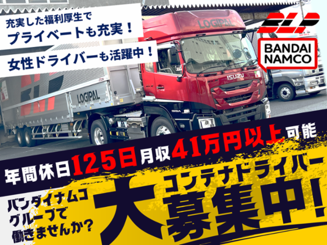仕事情報 ● 仕事内容 国内トップクラスの玩具メーカー・バンダイナムコグループの物流企業で大田区のコンテナドライバー(トレーラー)を募集!雰囲気もよく、無理なく働ける福利厚生で、働くメリットもたっぷり!歩合給はなく、固定基本給と時間外手当で安定して働くことができます!あなたも全国に「夢・遊び・感動」を一緒に届けてみませんか? 夢を届けるドライバー 『夢、遊び、感動』が詰まったバンダイナムコグループ商品をFanに届けきることが大切な役割である当社において、ドライバー職は大変重要な仕事です。社員の働き甲斐、生き甲斐を高める事で、企業としても新たな成長、発展を目指していきます。仲間と共に主体性をもってご活躍いただける方のご応募をお待ちしています! 「安全」への取り組み 当社では安全・安心に商品をお届けするために、「ドライバーへの運転技術指導」「管理者への教育」「車両の安全装置への投資」に力を入れて取り組んでいます。 安全・安心への取り組みにゴールは存在しません。これからも安全・安心なサービスでお客様の荷物を日本全国にお届けします! 大企業グループの安心感 国内玩具メーカーの代表格として知名度の高い「バンダイナムコグループ」の一員。大手企業の安心感を胸に働けます。残業代全額支給、年2回の賞与、評価に応じた昇給制度等はもちろんのこと、お誕生日プチプレゼントに加えて無事故手当の支給もあります☆有給休暇を利用しての10日間連続休暇も毎年取得していただけます! 働きやすい職場を整備 国土交通省が創設し、職場環境改善の取り組みを“見える化”している自動車運送事業者を認定する「働きやすい職場認証制度」(運転者職場環境良好度認証制度)。ロジパルエクスプレスは、この制度の「二つ星」を、20を超える拠点で取得(2024年11月現在)。今後もさらなる働きやすさを目指していきます。