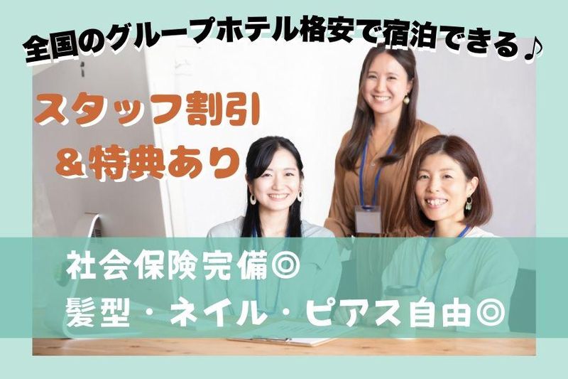 求めている人材 \ 未経験の方も大歓迎 / 経験は一切不問です! 事務のお仕事も初めて…という方も大歓迎! これから新しいお仕事に挑戦していきたい方も 安心してご応募ください♪ \ 語学スキルは不問です! / 海外からのお客様も利用されるホテルなので、 英語・韓国語が話せる方は 語学スキルを活かしてご活躍頂けます! ※語学スキルは必須ではありません、 日本語のみの方も大歓迎! \ 10~40代の男女スタッフ活躍中! / 幅広い年齢層・属性のスタッフが 協力し合いながら働いています◎ 未経験スタートの先輩も多数在籍中です♪ < こんな方にオススメ > ・一般事務でのお仕事経験がある ・データ入力・営業事務の経験がある ・受付の経験がある方 ・電話対応、コールセンターに興味がある方 ・英語力を活かしていきたい方 ・アルバイト、パートのお仕事探し中 ・ゆくゆくは正社員になりたい 気になる方は応募ボタンへ♪ お気軽にご相談ください!