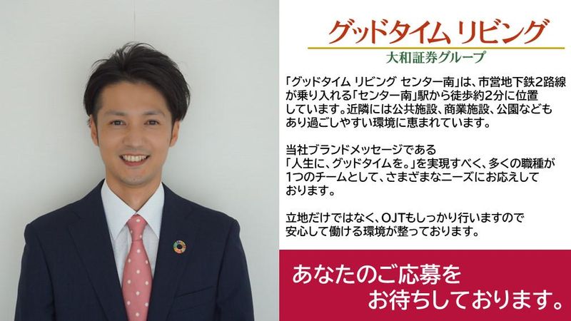 選考プロセス 【ステップ1】WEBエントリー ↓ 【ステップ2】面接 ↓ 【ステップ3】内定 ※選考結果は合否に関わらず、電話、メールまたは郵送でご連絡します。(5日〜10日程度) ※応募多数の場合、書類選考からご案内する可能性があります。 ※履歴書等の応募書類は返送はいたしません(弊社責任廃棄)。予めご了承ください。 【面接地・登録地】 グッドタイム リビング センター南 所在地:神奈川県横浜市都筑区茅ケ崎中央56-9