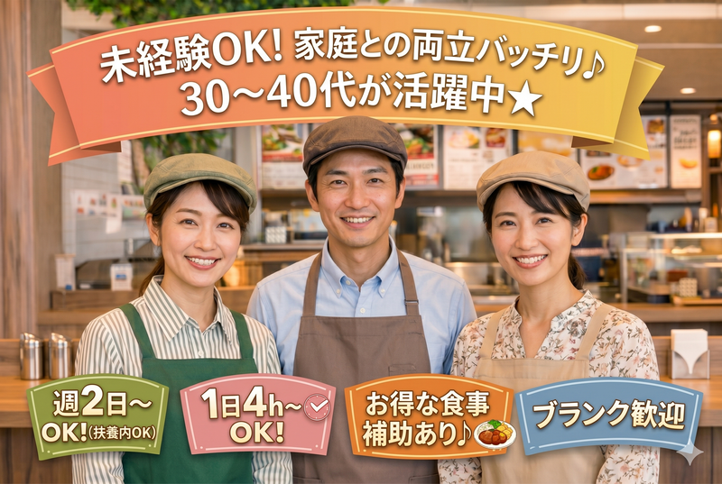 求めている人材 / 久しぶりのお仕事、 パート復帰も大歓迎! \ 「数年ぶりの社会復帰で緊張…」 「接客は初めてだけど大丈夫かな」 …そんな方もご安心ください! 先輩がしっかりサポートします☆ 分からないことはすぐに聞ける、 アットホームな雰囲気が自慢です♪ もちろん、 接客業・飲食業の経験ある方は 即戦力としてお迎えします♪ ⭐ブランク・未経験スタート大歓迎! ⭐性別・学歴・職歴は一切問いません! ⭐主婦(夫)パート歓迎 ⭐フリーターOK ⭐学生在籍(高校生も応募OK) 《 こんな方におすすめ 》 ・久しぶりに社会復帰をしたい方 ・家庭の予定を優先したい ・子供が学校に行っている間だけ働きたい ・扶養内で家計の足しにしたい ・落ち着いた雰囲気で働きたい方 ・料理や掃除などの家事スキルを活かしたい
