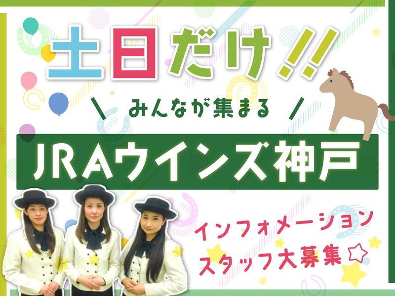 仕事内容 ◇・。週末は「JRAウインズ神戸」へ。・◇ インフォメーションスタッフ大募集★ マンガやアニメ、ゲーム、ドラマなどの 影響もあり、今や色んな方が集まる 場外競馬場。 街の中にあって気軽に行ける利便性から ウインズ神戸でも最近は特に学生さん、 他にはファミリーでの ご来場も増えています。 「みんなでワイワイ」かわいい制服で★ そんな雰囲気を土日だけ、 一緒に味わいませんか? ◇・。一緒に働くスタッフもたくさん。・◇ 1日の出勤人数は、なんと30名程! 頼れる仲間がたくさんいるので安心♪ 「ここで働いて友達が増えました!」 というスタッフも★ きっと楽しく働けると思いますよ! <お仕事内容は>…………………………… *受付カウンターでのご案内のお仕事* ●競馬開催に関する情報のご提供 ●館内のご案内 ●馬券購入のサポート ●カード発行手続き ●イベント開催時のお手伝い など ◇・。経験&知識がなくてもOK。・◇ 「マナーや接遇に自信がない…」 「競馬のことを全く知らない…」 という方もご安心を! まずは、研修からスタートします◎ 競馬の基礎知識とマナーを 身につけてから インフォメーションスタッフ デビューをいたしましょう★ 実際働いてからも多数の先輩スタッフが フォローしますので、ご安心ください♪