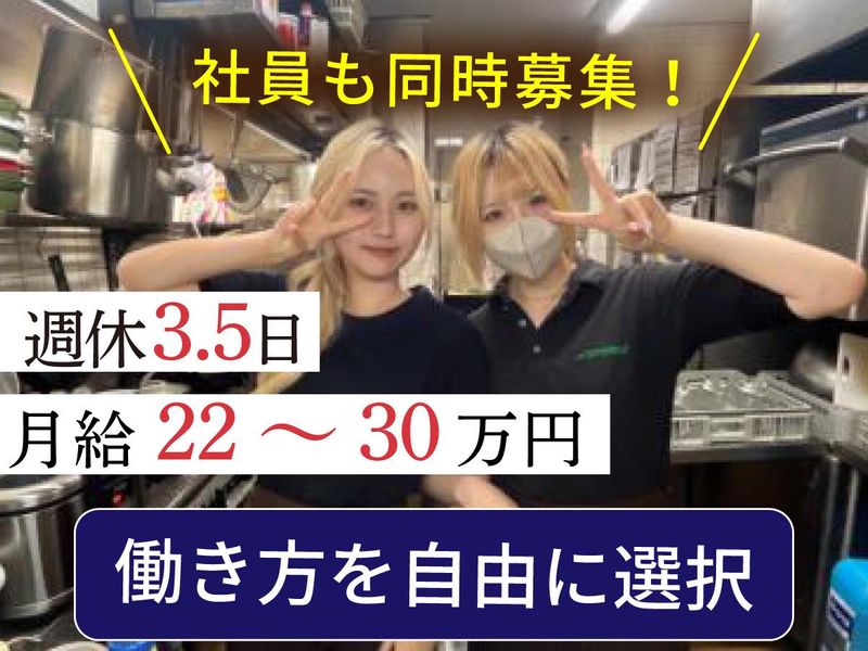求めている人材 ★フリーターさん大歓迎 フルタイム勤務歓迎/WワークOK しっかりシフトに入りたい方も歓迎! ゆくゆくは正社員を目指す方も 「どんな道を進みたいか」など気軽に相談ください ★主婦さん歓迎 ランチタイムのみの勤務もOK 遊ぶときは遊ぶ! 仕事のときは真面目にしっかり仕事する! というメリハリのある考え方で、 毎日楽しく働ける環境ですよ♪ 飲食が初めての方も、 実は正社員になりたい!という方も、 皆さん大大大歓迎します! 20~40代活躍中のお店です♪ - 【社員登用制度有】 ※他の店にはない最高の待遇です♪ 時間:11:00~15:30、17:00~23:30 給与: 週休2日(シフト制)⇒月給30万円~ 週休3日(シフト制)⇒月給25万円~ 週休3.5日(シフト制)⇒月給22万円~