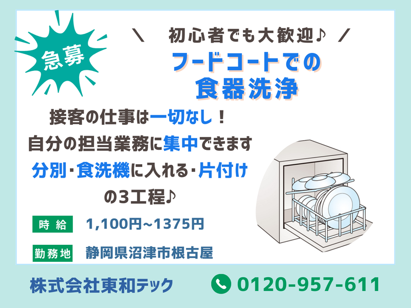 仕事内容 ✨【募集日程】12/26~スタート✨ 12/30~1/3の期間は時給50円UP! 週1日~OK!1日4時間~OK‼ 超カンタン!履歴書不要! 【食器洗浄】バイト ⭐ ⏩ たった4時間で完了!? スグに覚えられる超シンプル作業! 「はじめてのバイトを探しているけど、 どれも難しそうで不安…」 「空いた時間にサクッと稼ぎたい!」 そのお気持ち、よく分かります。 この仕事は、そんなあなたの理想に ぴったりの、まさに「魔法のバイト」! ******************* この仕事があなたを幸せにする3つの理由 ❶ 誰でも3ステップでプロになれる! 1分で理解!超シンプルな流れ! ①食器を分別 (ゴミ・陶器の器・プラのコップなど) ②食洗機にセットしてボタンをポチッ ③ベルが鳴ったら取り出して拭き、 所定の位置に置く たったこれだけ! 複雑な作業は一切ありません。 誰でもすぐにマスターできるから、 未経験でも安心です。 ❷ スグに稼げる!「日払い」制度あり! 「給料日まで待てない…」 「急な出費でお金がピンチ…!」 そんな時でもご安心ください。 日払い制度があるので、 働いたその日にお給料GET! サクッと稼いで、すぐに使える! お財布にも優しいお仕事です。 し・か・も… 交通費も1勤務につき500円支給! 実働6時間~でまかない(食事補助)あり♪ ❸ 働き方の自由度、無限大! 「週末だけ」「連休中のみ」 「授業やサークルに合わせて働きたい」 ➡OK‼ 「朝から」「午後から」「夕方開始」など ライフスタイルに合わせて働けます! 週1日、1日4時間からOKなので、 プライベートもバイトも諦める 必要はありません。 ******************* 「まずは試してみようかな」と思ったら、 履歴書不要でご応募ください! この求人を見て「気になるな」と 思った方は、まずは一度ご連絡ください。 面接というより、ざっくばらんな お話から始めましょう! あなたの「やってみたい」を応援します。 *******************