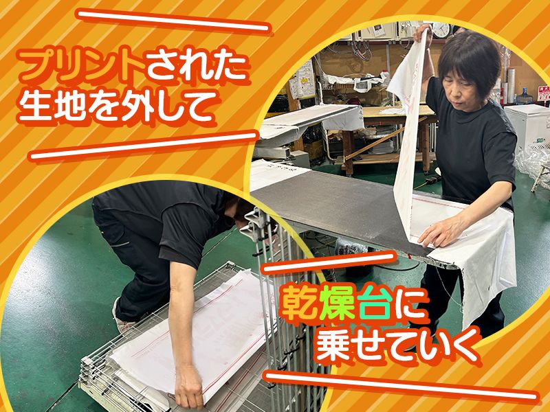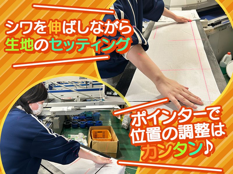 アピールポイント: \モノづくりが好きな方歓迎/ 真っ白の生地に、 どんどんデザインが印刷されていく工程は 見ているだけでもおもしろい! 1色ずつだんだんとデザインが 出来上がっていく工程も楽しいですよ♪ ─・─・─・─・─・─・─ 有名アーティストや プロスポーツチームのグッズ製造に 携わることもあります! あなたの推しのグッズを担当することがあるかも…⁉︎ ─・─・─・─・─・─・─ 20代〜40代のスタッフが多数活躍中! まだ入って間もない方や、 20年以上働いているベテランの方まで 様々な方が在籍しています◎ 先輩がしっかりフォローしてくれたり、 忙しいところはお互いに助け合ったりと 協力しあえる環境です♪