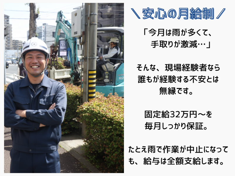 仕事内容 \\\ ✨電話応募OK✨ /// 052-737-2313 担当/総務課 ⭐59歳以下全員面接!⭐ セカンドキャリア・女性の転職も応援◎ 当社は公共工事や地域のインフラ整備を手掛けています。 あなたには、土木工事現場での 重機オペレーター業務をお任せします。 *‥‥*‥‥*‥‥*‥‥*‥‥*‥‥* ⭐月給32万円~の固定給×天候に左右されない! ⭐日祝休み+大型連休年3回 ⭐有給取得率ほぼ100%! ⭐資格取得も応援!スキルアップ可能 ■技術をそのままに、働き方を「安定」へ。 ┈┈┈┈┈┈┈┈┈┈┈┈┈┈┈┈•• 「雨が降るたびに給料が減るのが怖い」 「残業続きで、家族や自分の時間が持てない」 「体力的に、大きな現場の ハードな作業がキツくなってきた」 こんな不安を抱えるベテランの皆様、 立志建設でその技術を「一生モノの安心」 に変えませんか? 当社は社長の 「社員の生活を守りたい」 「頑張ってくれている人 にきちんと還元したい」 という強い想いから、業界では珍しい 【完全月給制】と【充実の福利厚生】 を整えています。 ■当社の「重機オペ」ならではの魅力 ┈┈┈┈┈┈┈┈┈┈┈┈┈┈┈┈•• ✅ 天候に左右されない「完全月給制」 「今月は雨続きで通帳を見るのが怖い…」 そんなストレスはもうおしまい。 2025年10月より導入した月給制により、 雨で現場が休みになっても、 月給32万円〜を全額支給します。 ✅ 比較的小型の重機がメイン! 道路工事などで使用する、 扱いやすいサイズの重機(小型ユンボ等) が中心です。 「大きな山を削るようなハードな工事」 とは異なり、 街のインフラを整える細やかな作業が主役。 これまでの経験を活かしつつ、 長く無理なく続けられる環境です。 ✅【長く働ける】 これから10年を安心して働ける制度 「この先も、安心して長く働きたい」 そんな想いに応えるため、 「退職金制度」や「再雇用制度(規定有)」も整備。 実際に40代・50代のミドル層が中心となって活躍中! あなたのセカンドキャリアを、 会社全体でバックアップします。 ✅【休みも充実】 有給取得率100%&大型連休 「休みたいけど、言い出しにくい…」 そんな雰囲気は一切ナシ! 有給取得率は、なんとほぼ100%! 通院や、家族サービス、趣味の旅行など、 気兼ねなく取得できます◎ さらに、GW・夏季・年末年始は【各9連休】(実績あり)! 大型連休でしっかり体をリフレッシュできるのも、 長く働ける秘訣です✨ ■仕事内容 ┈┈┈┈┈┈┈┈┈┈┈┈┈┈┈┈•• 公共工事や地域のインフラ整備がメインです。 あなたには、道路工事や河川工事における 「重機操作」および「現場作業」をお任せします。 ・重機オペレーション └ユンボなどを操縦し、 道路の掘削、土砂の積み込み、 整地・埋め戻し作業を行います。 ※比較的小型の重機がメインです。 ・施工補助、手元作業 └重機に乗っていない時間は、 周囲の安全確認や型枠の運搬、 現場の整理整頓など、 チームのサポート業務も行います。 ・片付け、清掃 └現場の安全と整理整頓を保つ、 大切な仕事です。 ■採用担当からメッセージ ┈┈┈┈┈┈┈┈┈┈┈┈┈┈┈┈•• 「日給制のままじゃ、将来が不安だ…」 もしそんな悩みを抱えているなら、 一度お話ししませんか? 当社が月給制に変えたのは、 社員に“心からの安心”を届けたかったからです。 あなたの長年の現場経験は、当社にとって宝物です。 スーツ不要、いつもの服装で構いません。 面接は1回のみ。 まずはお電話だけでも歓迎です。 2年目以降は、あなたの頑張りを 昇給や賞与で最大限還元することをお約束します。 【電話応募】052-737-2313(担当:総務課) 「求人を見た」とお伝えいただくとスムーズです。 アナタからのご応募を、心よりお待ちしています。