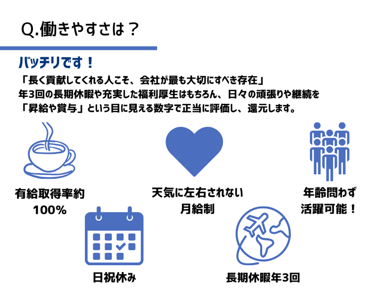 職場環境 \男女問わず活躍中!定着率も抜群✨/ ✅ フラットで優しい職場 …ベテランも新人も関係なく、みんなで助け合う雰囲気。 ✅ 長く安心して働ける環境 ✅ チームワーク抜群!