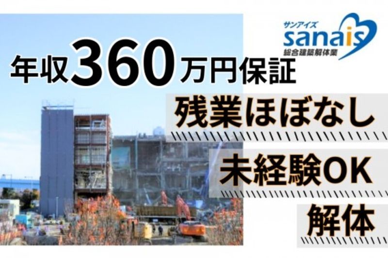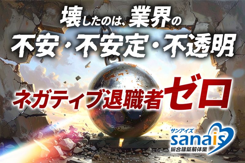 【仕事内容】 「解体現場より先に、働き方を解体しました。」 壊したのは建物じゃない。 業界の 「不安」「不安定」「不透明」。 月給制で安定、正社員だけの職場、髪型自由。 新しいカタチの解体会社、サンアイズ。 【 サンアイズが壊したもの 】 ✅日給の波に振り回される働き方 ✅毎朝の「今日の現場メンバー誰?」の不安 ✅長時間労働が当たり前という空気 ✅「人が辞めるのが普通」という常識 これらはすべて、解体済みです。 【 変えた、残したもの 】 ・月給30万〜の固定給 ・昨年賞与3ヶ月分 ・全員正社員(派遣・APゼロ) ・髪型・髪色自由 ・残業ほぼなし 壊すのは建物だけでいい。 働く人の生活や心まで壊す必要なんてない。 それが当社の考えです。 【お仕事内容】 ・重機や手作業で壁・柱を撤去 ・解体した建材の分別 ・産業廃棄物の収集・運搬 ・防音・防塵シートを設置 ・現場の整理整頓、道具の管理 など 未経験でもできる作業からスタート。 まずは普通免許を持っていればOK❗ ~~~~~~~~~~~~~~~~~ ✅成長ルートも“見える化”しました ~~~~~~~~~~~~~~~~~ 最初の半年〜1年は、現場で基礎からしっかり学ぶ期間。建物の構造や作業手順、安全管理など、解体に必要な土台をしっかり作ります。 その後は、あなたの得意や適性に合わせて、「どんなポジションで成長したいか」 を上司と話し合って決めていきます。 資格取得は会社がサポート。 スキル → 仕事の幅 → 給与 が、連動して上がっていく仕組みです。 ~~~~~~~~ ✅検討中の方へ ~~~~~~~~ 解体の仕事はハードに見えるかもしれません。 しかしそんな環境は、既に解体済みです。 壊すのは建物だけで十分。 あなたの生活や個性は壊さず、大切に守ります。 安心して続けられる環境を整えたのは、社員みんなに長く働いてほしいから。 ご応募、お待ちしています。 【求人ID-KTR】
