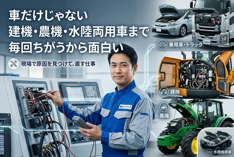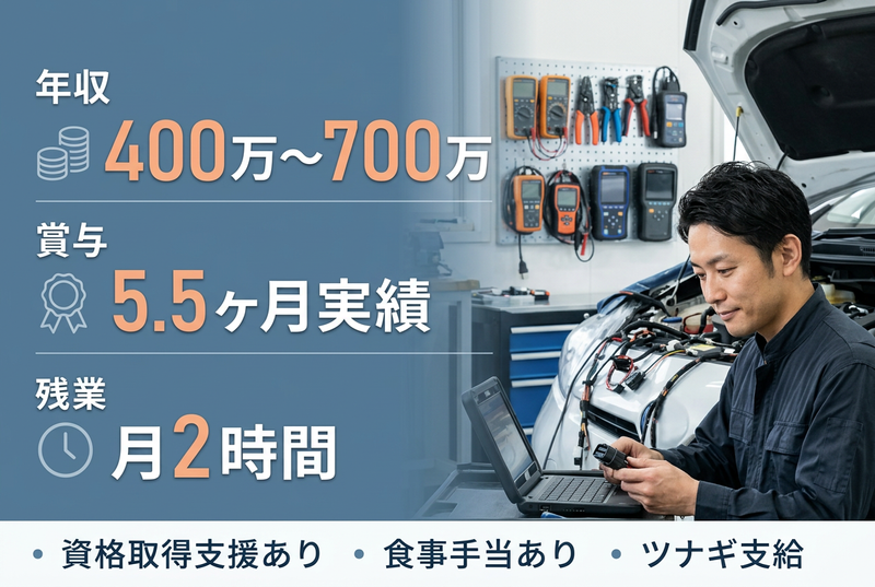 仕事内容 ⭐️この求人のアピールポイント⭐️ ✅️ 年収400万円~700万円、賞与年2回・前年度実績5.5ヶ月分の好待遇です ✅️ 未経験から整備アシスタントとしてスタートし、7~8年かけて専門技術を身につけられます ✅️ 自動車だけでなく、建設機械・農業機械・水陸両用車まで幅広い電装整備に携われます ✅️ 残業は月2時間程度と少なく、実働7.5時間・休憩90分で無理なく働けます ✅️ 2代目社長が現場で直接指導。少数精鋭ならではの距離の近さで成長できます ✅️ 競合の少ないニッチな専門分野で、地域に必要とされる技術者を目指せます — 📋仕事内容 自動車や建設機械、農業機械の電気系統を診断・修理・メンテナンスする、専門性の高い電装整備の仕事です。 <具体的な業務内容> ■電装品の診断・修理 ✅️ センサー、制御ECU、モーターなど電気関係部品の故障診断 ✅️ 電装品の修理、補修、保守作業 ✅️ 故障診断機器を使ったトラブルシューティング ✅️ 1日平均2~3台の車両・機械を対応します ■取付・現場対応・付帯業務 ✅️ カーナビ、バッテリー、ドライブレコーダーなどAV機器の取付・配線作業 ✅️ 自動車、建設機械、農業機械、水陸両用車の電装整備対応 ✅️ 工場内作業を中心に、滋賀県内への出張整備にも対応します ✅️ 顧客対応、見積作成、部品発注などの付帯業務も担当します - 🏢会社の魅力 有限会社川村電装は、滋賀県長浜市で自動車・建設機械・農業機械の電装整備を専門に手がける会社です。車両の「頭脳」ともいえる電気系統に特化し、地域の産業インフラを支える存在として信頼を積み重ねています。 ✅️ 電装整備に特化した専門会社 一般的な機械整備とは異なり、センサーや制御ECUなど電気系統の診断・修理に強みがあります。 ✅️ 多彩な車両に触れられる環境 自動車だけでなく、農業機械、建設機械、水陸両用車など幅広い分野の電装整備に携われます。 ✅️ 半世紀にわたる技術とノウハウ 電装整備一筋で培ってきた技術力があり、現場で実践的に専門技術を学べます。 ✅️ 少数精鋭で成長しやすい職場 社長や先輩との距離が近く、質問しやすい風通しのよい環境です。 ✅️ 安定した業績と将来性 競合が少ない専門分野で売上も好調。2代目社長のもとで、伝統と新しい挑戦の両立を進めています。 - 💼入社後の流れ 未経験の方も、整備アシスタントとして基礎から学び、時間をかけて一人前を目指せる育成体制です。 入社後は、工具の準備や部品交換の補助、診断機器の操作補助など工場内でのサポート業務からスタートします。社長の出張先へ同行したり、ベテラン社員から作業の流れを学んだりしながら、道具の名前や仕事の進め方を少しずつ覚えていきます。慣れてきたら適性に合わせて担当範囲を広げ、7~8年かけてじっくり技術を身につけていく想定です。 ✅️ 40代の社長が現場で直接指導します ✅️ 未経験でも焦らず段階的に成長できます ✅️ 分からないことをすぐ相談しやすい環境です - 🎯募集背景 ✅️ お客様からの相談・問い合わせが増えており、対応体制を強化するための増員募集です ✅️ 地域のニーズに応え続けるため、将来を見据えた技術者育成を進めています ✅️ 2代目社長の新体制のもとで、次世代を担う仲間を迎えたいと考えています