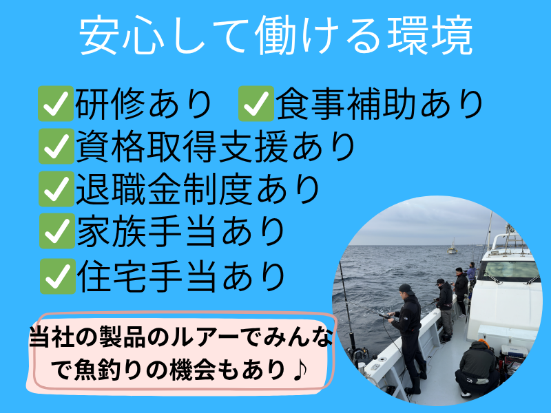 【保険制度】 雇用保険、労災保険、健康保険、厚生年金 待遇・福利厚生 【福利厚生】 *車・バイク通勤可(駐車場完備) *転勤なし *メンター制度あり *入社後の研修制度あり *まかない・食事補助制度あり:1食140円 *全額会社負担の資格取得支援制度あり(規定あり) *制服あり *レジャー事業部あり 釣り具(ZERODRAGON)の各種道具の貸出あり *退職金制度あり *再雇用制度あり(上限65歳) *定年制(一律60歳)