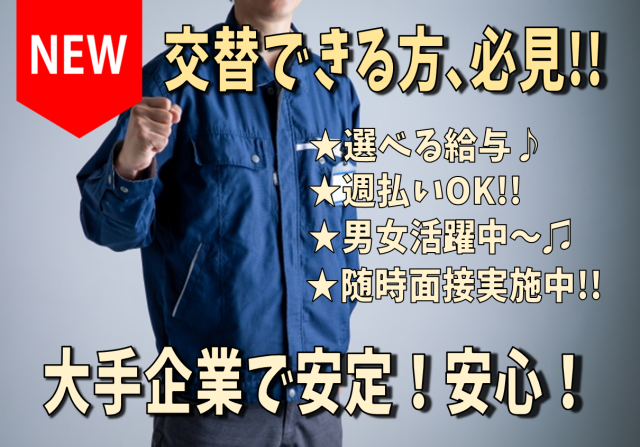 勤務曜日・時間 ① 8:30~17:15 ② 16:05~24:50 ③ 0:15~9:00 ※1週間毎の3交替勤務 ■実働時間 7時間45分 ■休憩 45分~ ■残業ほぼナシ! 【期間】 ※勤務開始日: 即日からでもOK ※勤務期間: 短期、長期OK ◆職場見学は随時実施中♪ ◆勤務開始日はご相談ください!