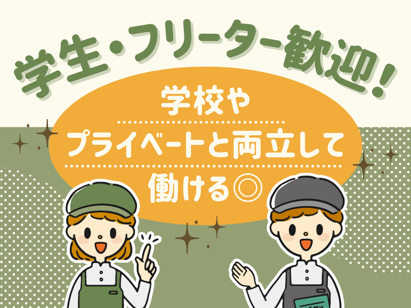 求めている人材 <学生さん活躍中!> *高校生OK! *バイトデビューも大歓迎! *フリーターさんも大歓迎! *「平日は学校終わり」「土日はガッツリ」 など希望の働き方をご相談ください! *短時間・長時間希望、どちらも大歓迎
