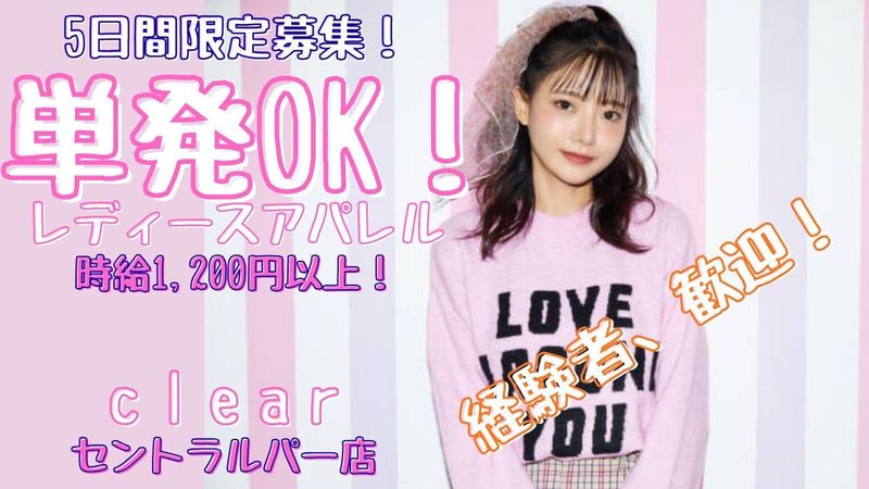 仕事内容 ~ゴールデンウィーク期間限定~ 単発就業OK!1日のみOK! ⭐5/1(金)~5/5(火)の五日間限定募集⭐ ✅アパレル販売経験者、時給UP!! ✅販売・接客経験のある方、大歓迎! ✅5日間フルタイム勤務できる方、歓迎! ================== 【お仕事内容】 ■接客販売 ■試着室対応 ■在庫補充 ■店内整理整頓 など フロアでお客様へのご挨拶や、 コーディネートのご提案など お客様のご対応をメインに お願いします^^ ================== 【ブランド紹介】 ≪clear≫ カジュアル・フェミニンと幅広い テイストのお洋服が揃う、 レディースアパレルの店舗です^^ 価格も手ごろな物が多く販売しやすい アイテムが多いのも特徴です♪ ================== ✅ネイル・髪色自由! ✅服装自由! ※ブランドイメージに合うもの推奨 ✅単発OK! ✅交通費全額支給 ✅ノルマ無し ✅学生、歓迎! ✅clear好きな方、大歓迎!